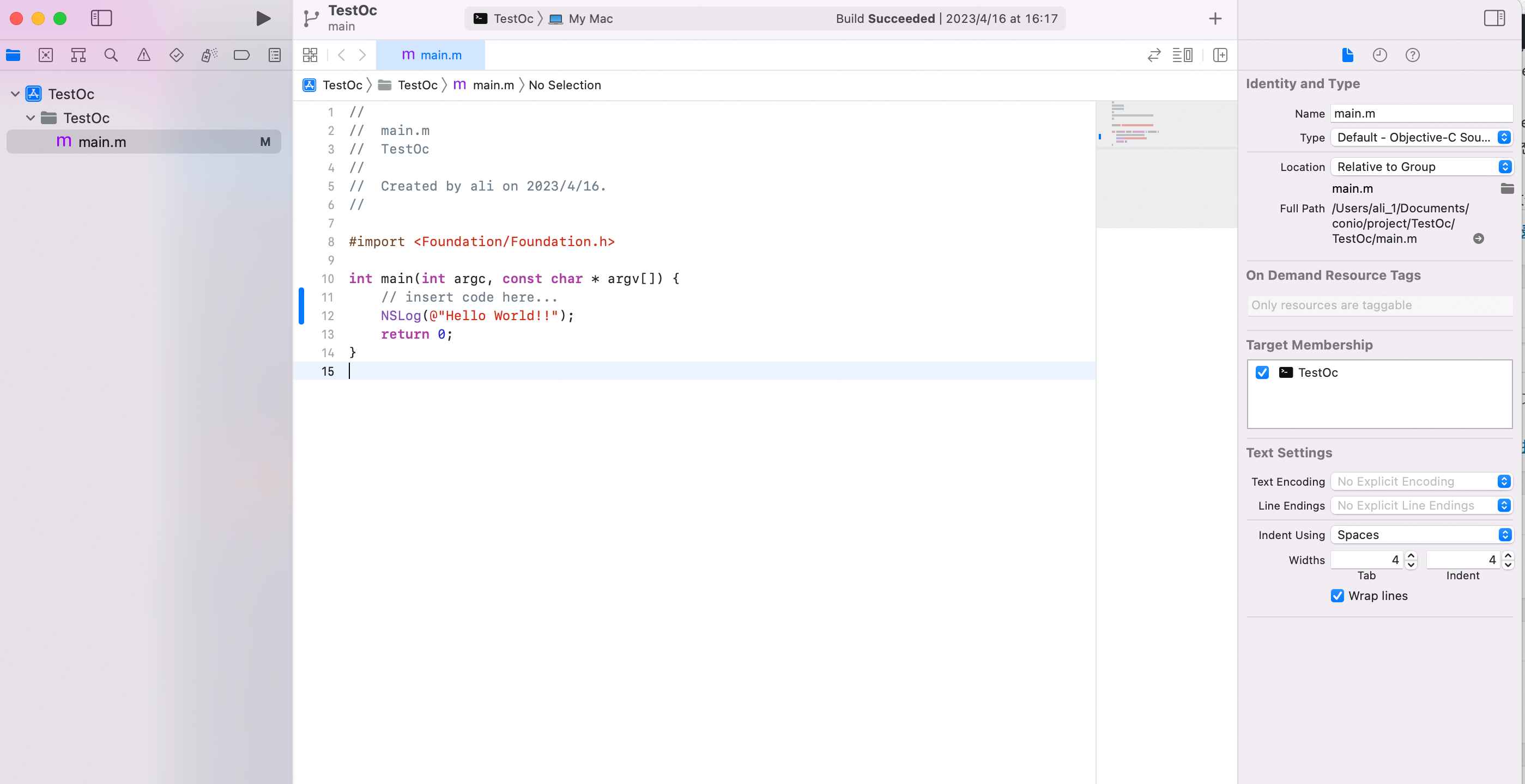 2023-04-22 15:01:05.008596+0800 TestOc[3568:56890] Hello World!!