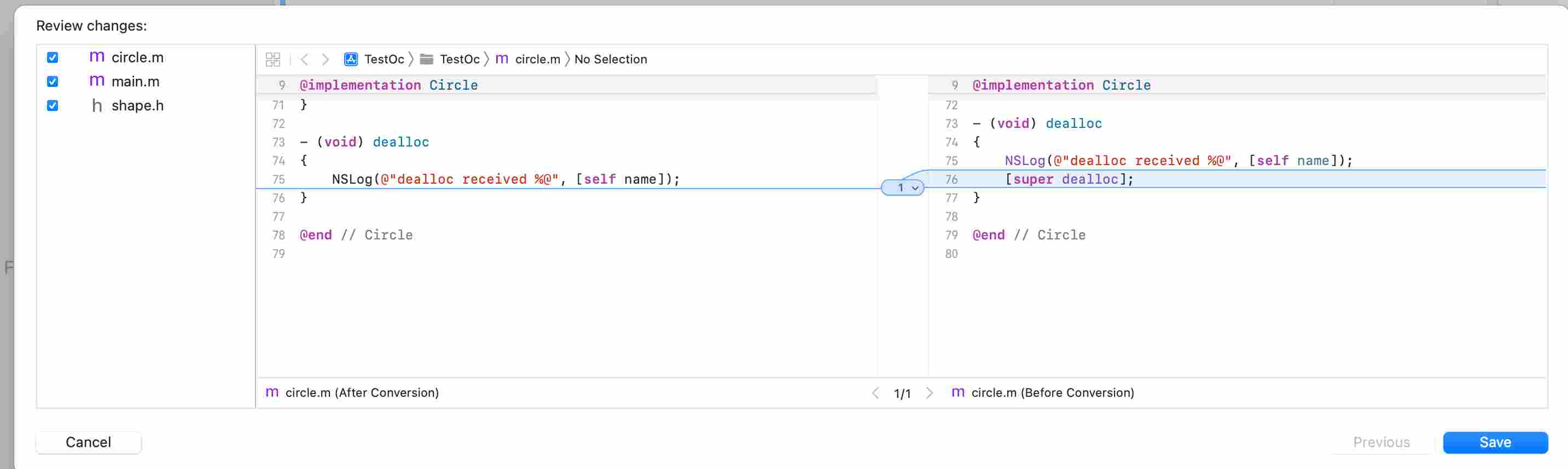 我们简单的将HelloWorld程序按照入口和日志打印的实现来拆分为3个文件:主入口(main.m)、打印方法申明的头文件(print.h)和打印方法实现的文件(print.m),拆分后如下: