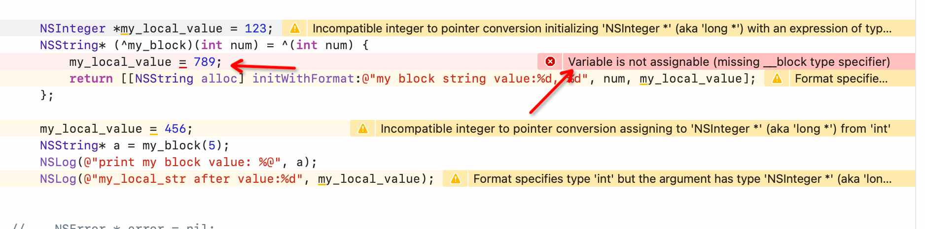 __block NSInteger *my_local_value = 123;
