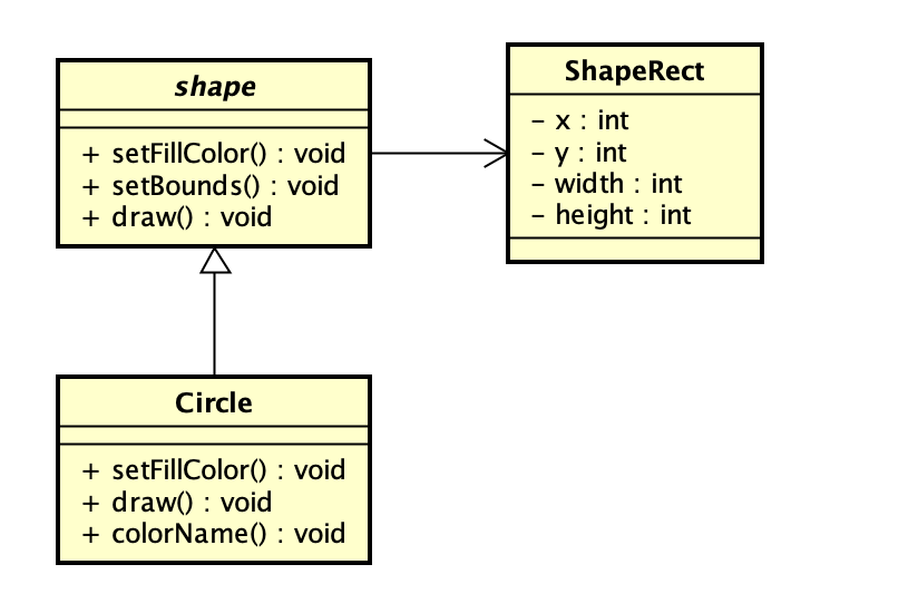 我们写一个这样的示例:有一个shape类,它包含设置颜色和设置边界、以及绘制的draw方法。另一个类Circle,它实现自己的draw方法,同时根据自己的需要重写了setFillColor方法。UML图如下: